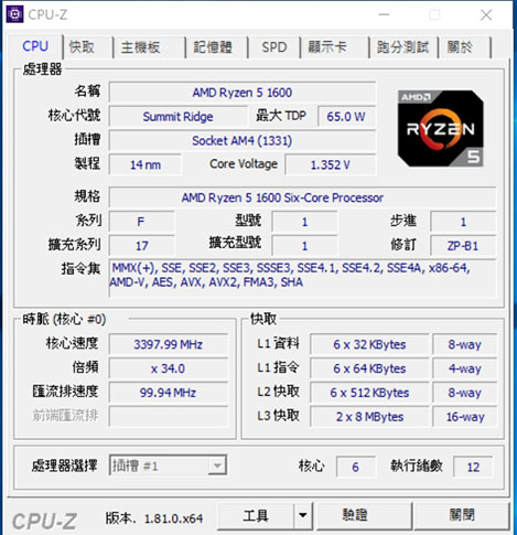 | CPU-Z中CPU AMD Ryzen5 1600 |