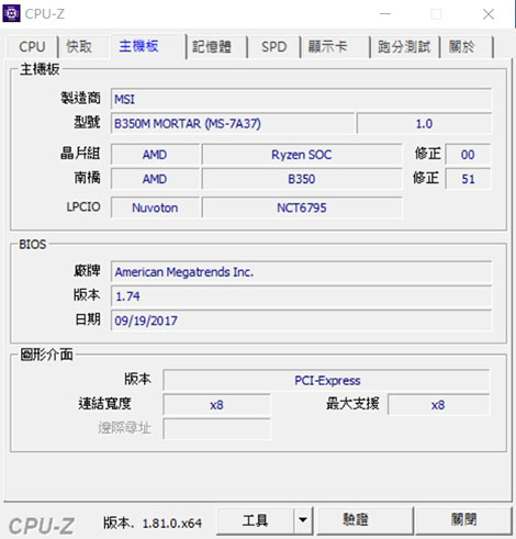 | CPU-Z中主機板 MSI B350M MORTAR |
