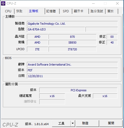 CPU-Z中主機板 GIGABYTE GA-870A-UD3 |
