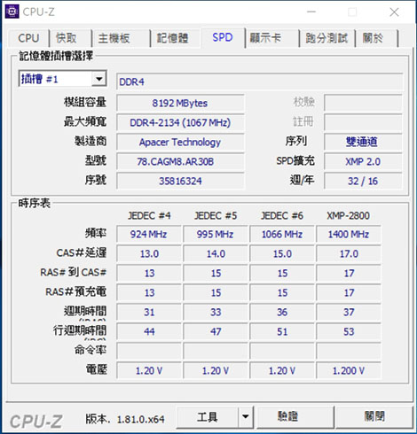 | CPU-Z中SPD Apacer DDR4 |