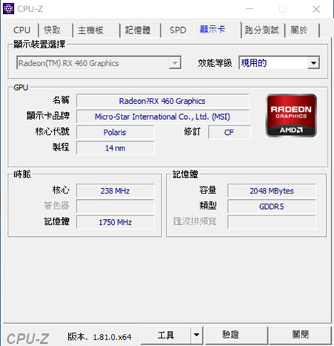 | CPU-Z中顯示卡 AMD Radeon RX460 |