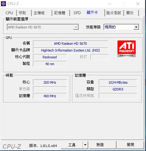 CPU-Z中顯示卡 PowerColor Radeon HD 5670 1G |