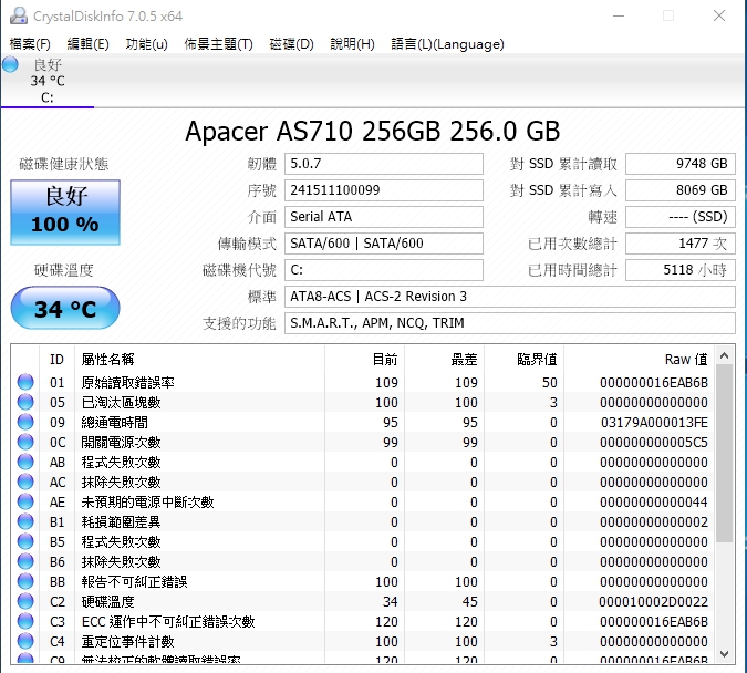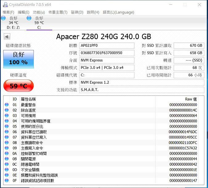 Apacer PT920 PCIe Gen 3 x4 240GB SSD(電腦系統中顯示Apacer Z280 240GB)