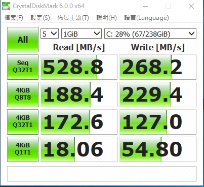 Apacer AS710 256GB SSD 讀取:528.8 MB/s 寫入:268.2 MB/s |