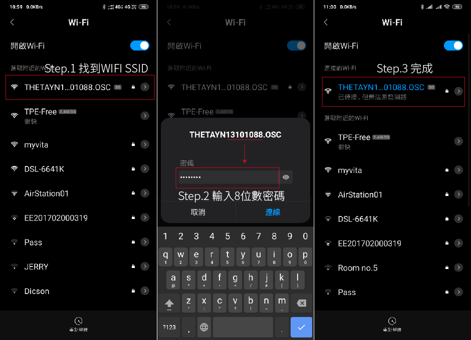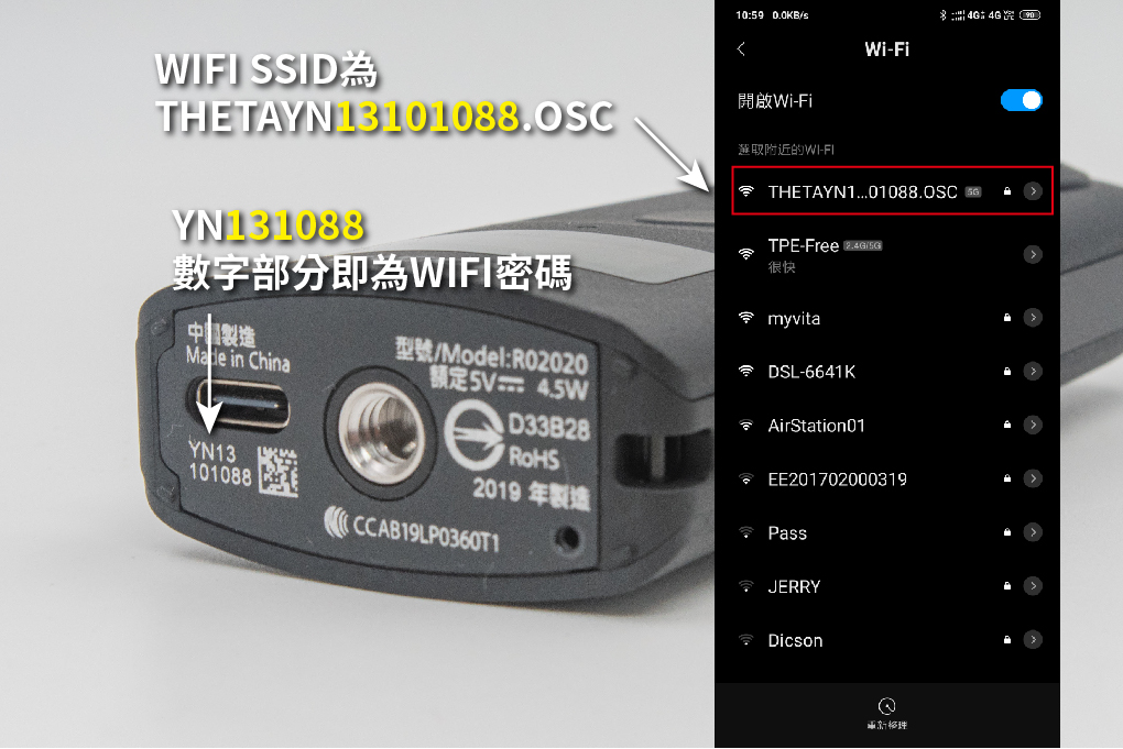 手機打開WIFI會找到一個THETAYN13101088.OSC的WIFI SSID