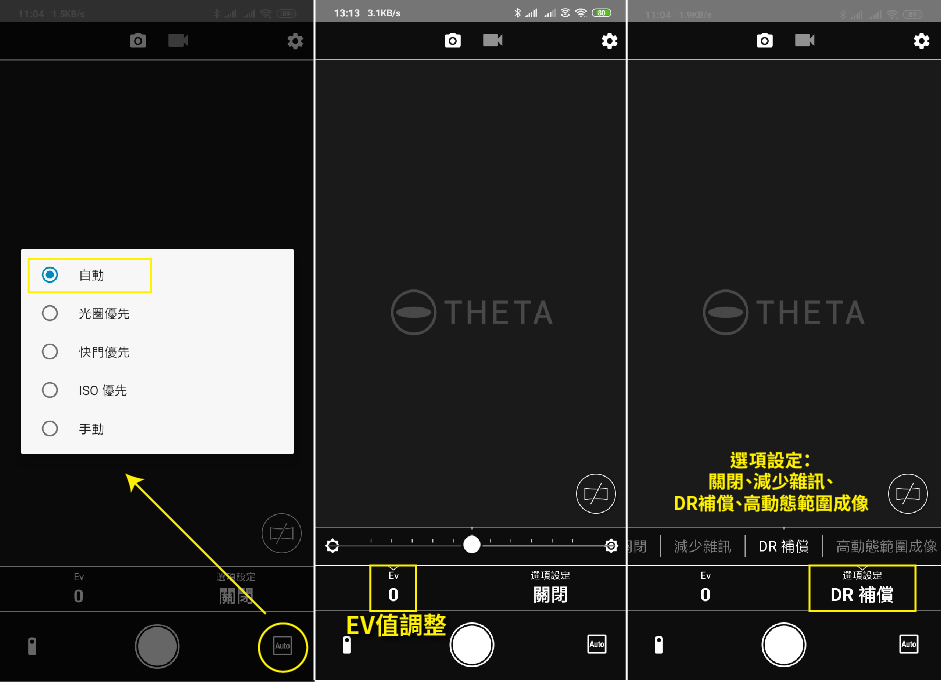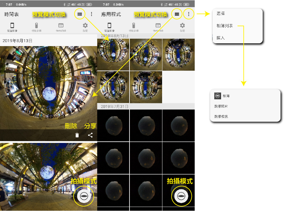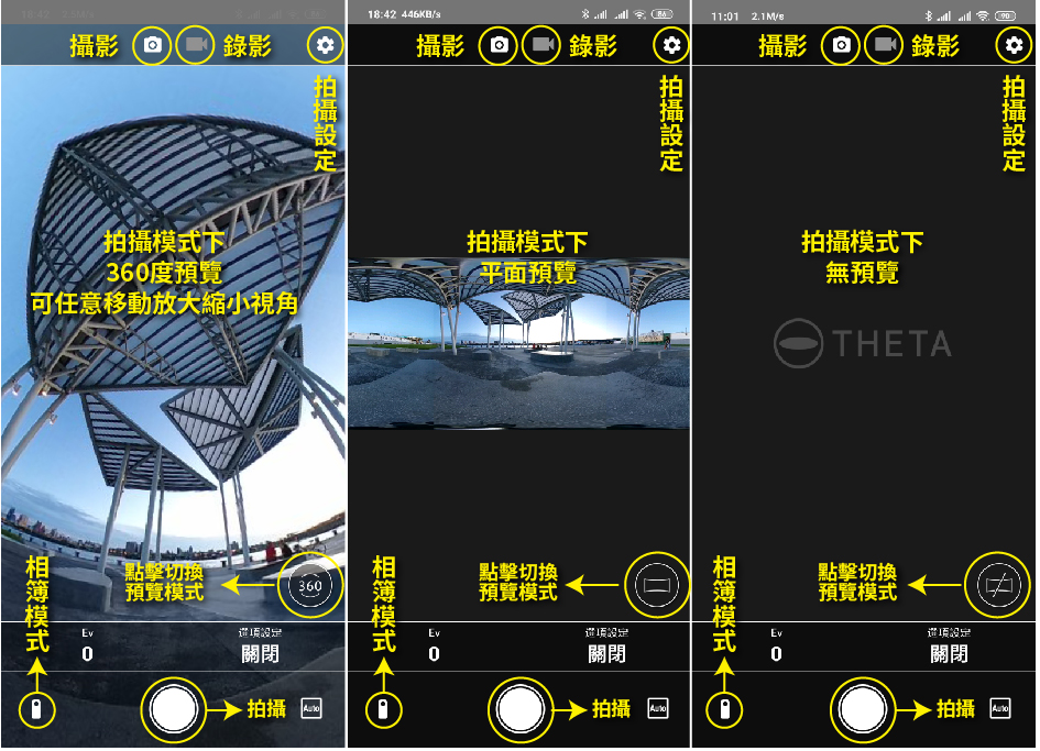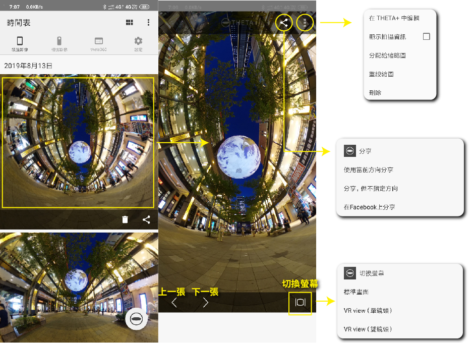 這邊先文字介紹一下THETA+APP功能,由上往下、由左至右
