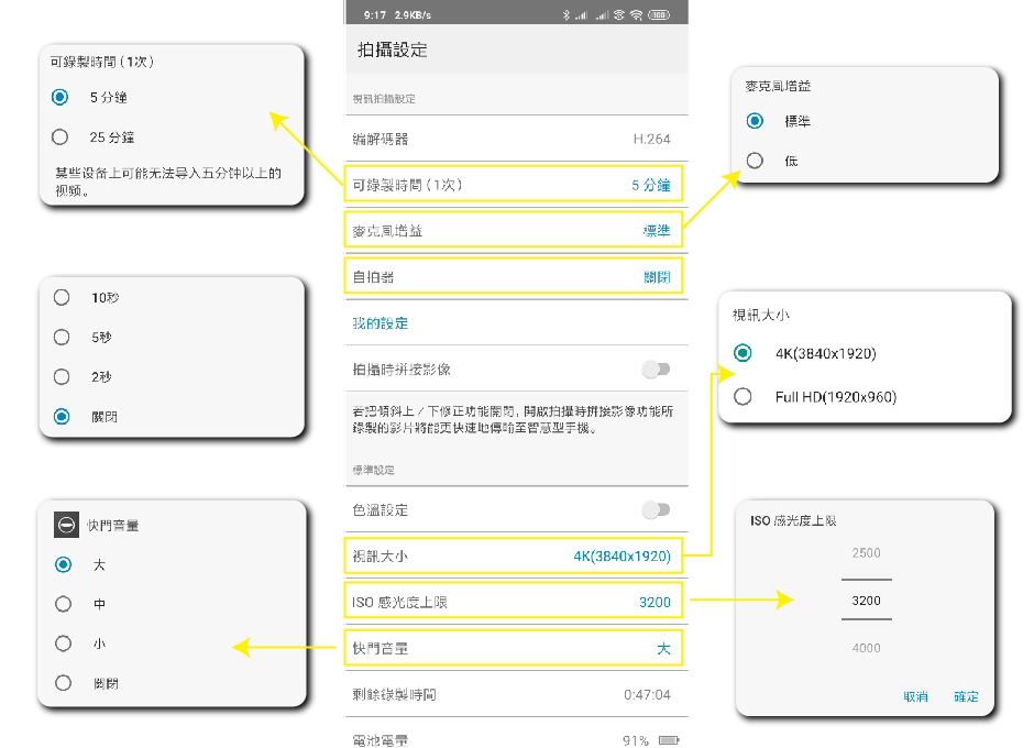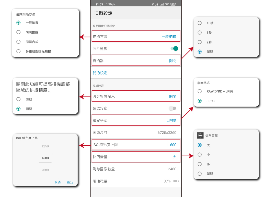 攝影模式中的拍攝設定選項