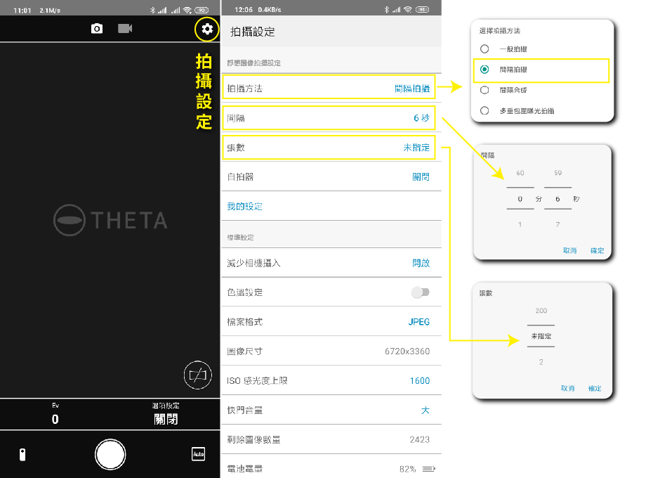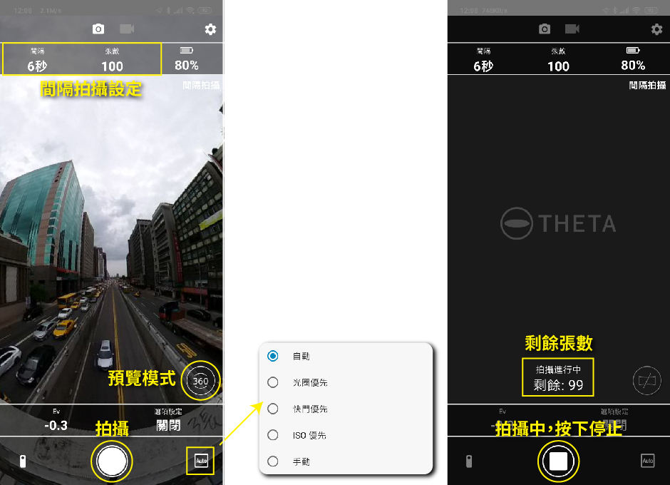 以下利用THETA APP間隔攝影功能,THETA+ APP 定時攝影功能