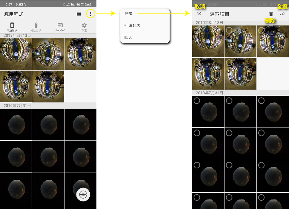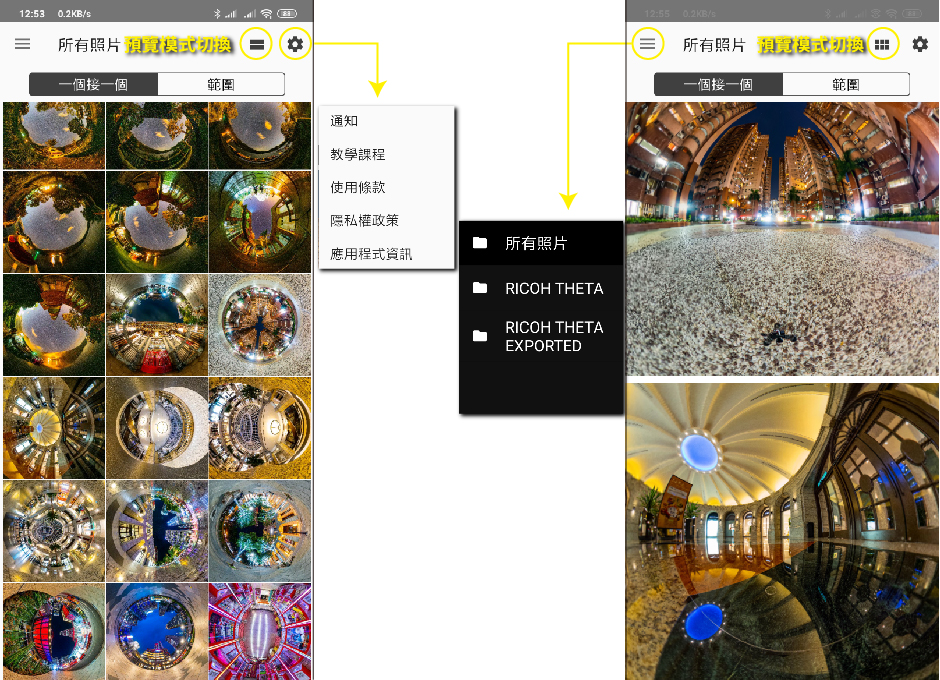 左上三橫線:所有照片、RICOH THETA(照片資料夾)、RICOH THETA EXPORTED(影片資料夾)