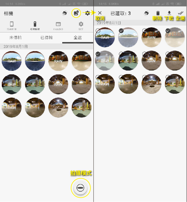 THETA APP主要有兩個介面,一個是拍攝模式、一個是相簿模式