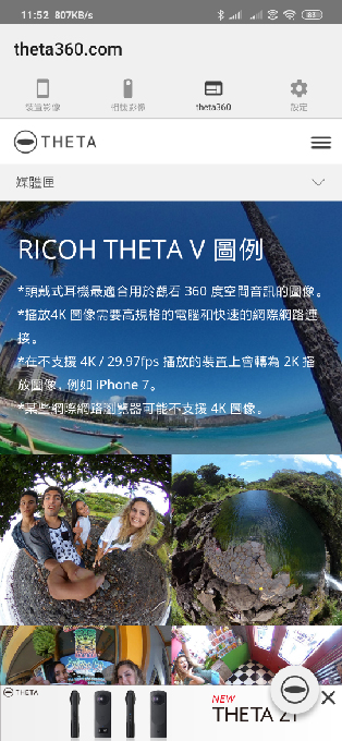 手機有上網狀態下出現的THETA網頁