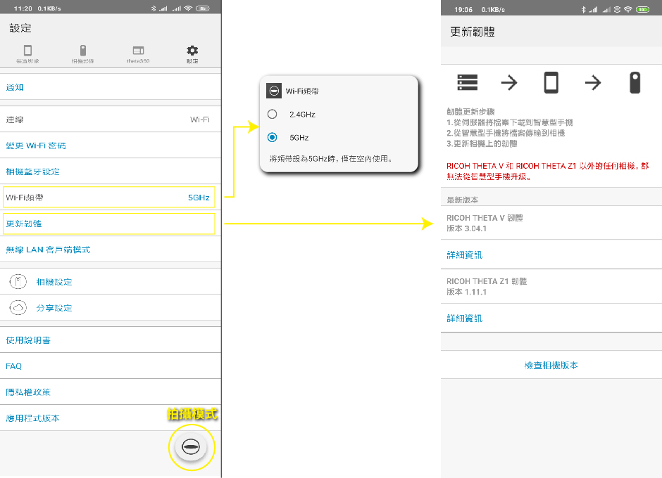 RICOH THETA Z1本身有2.4G/5G兩種WIFI,只能選其一,預設為2.4G,一樣可以更改,後面再說明