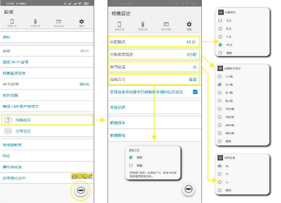休眠模式、自動關閉電源、快門音量、傳輸方式…等等都可以選擇
