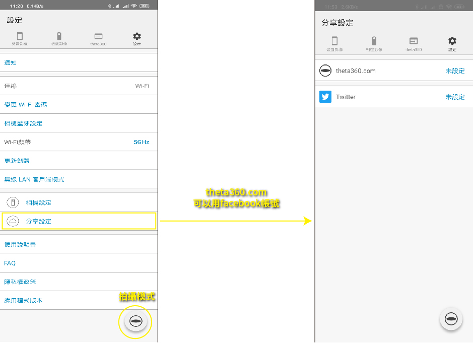 分享設定中,提供了theta360帳號、Twitter帳號綁定