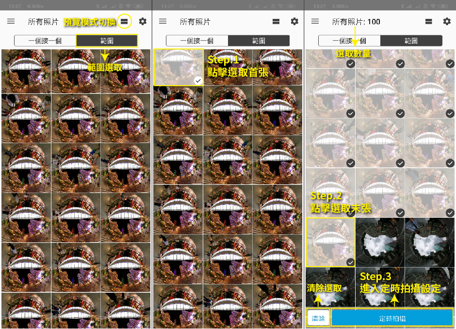 範圍選取只要選擇首跟末的照片即可,再來按下下方的定時拍攝就會進入定時拍攝設定