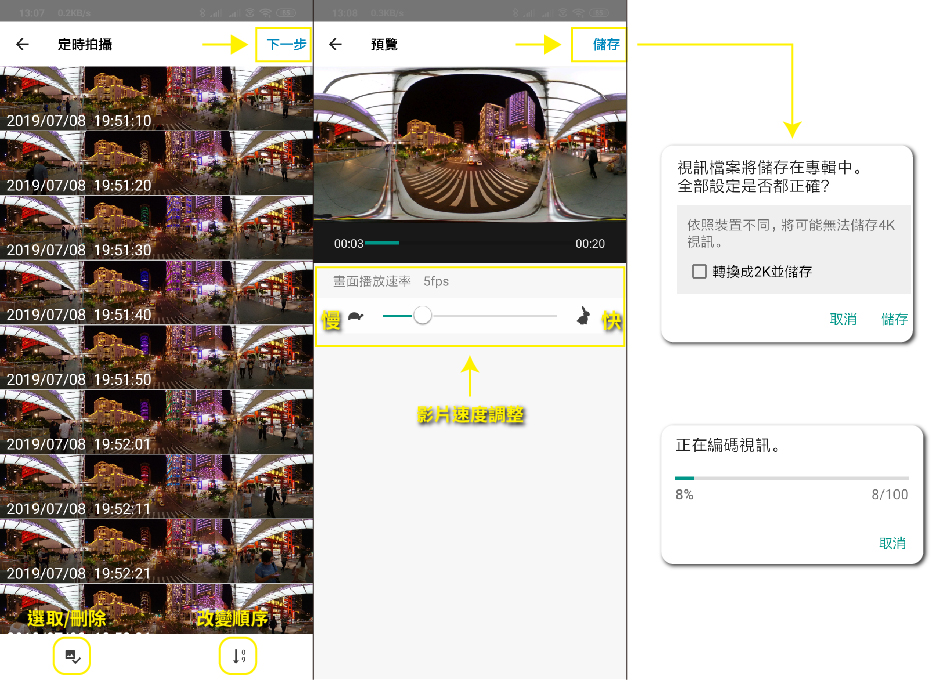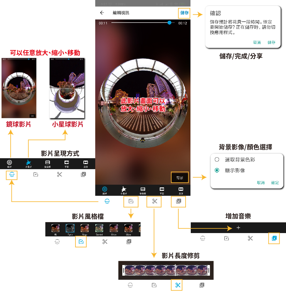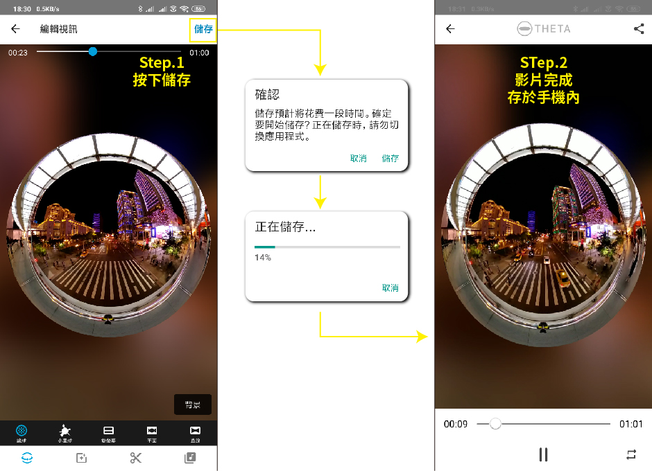 360影片編修完後按下儲存,會有確認畫面&等待畫面,之後影片就完成了,此時影片存在於手機中