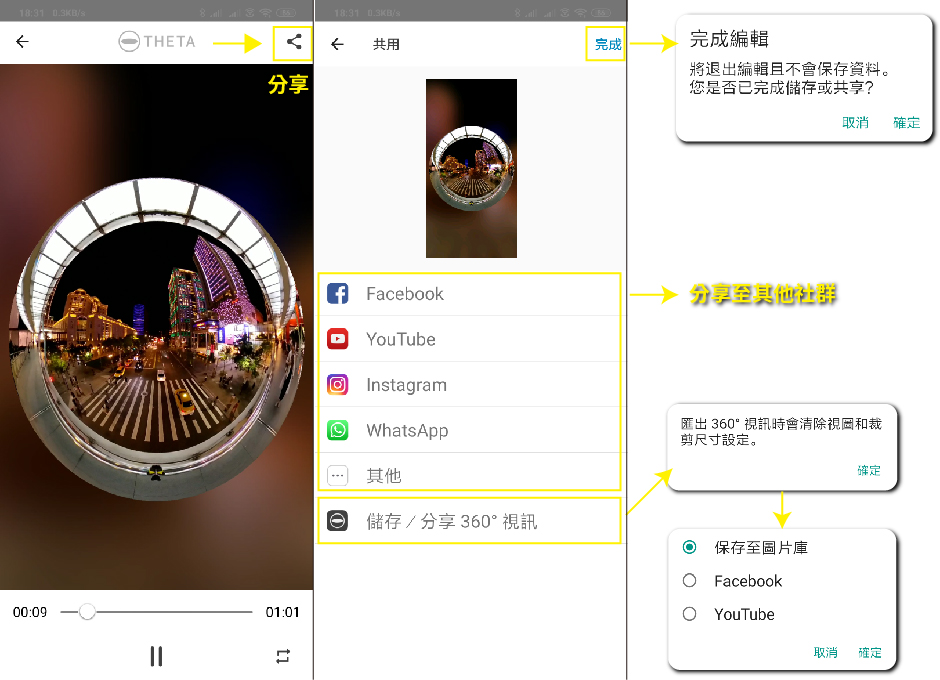 按下分享,就會出現分享選項,建議分享到其他社群,不要儲存/360視訊