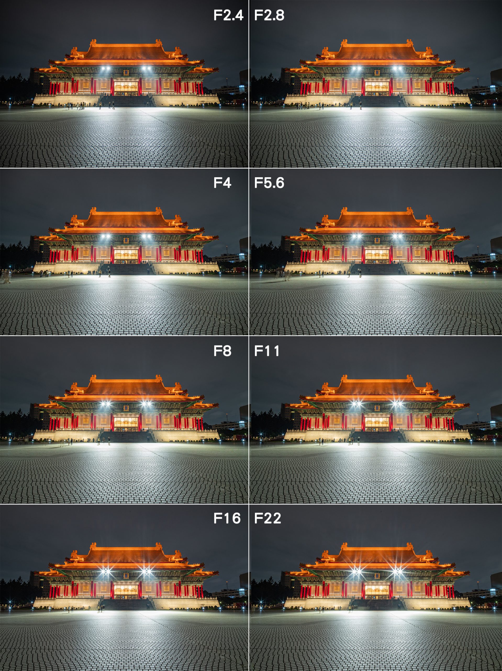F11星芒偏左斜、F16星芒為正米字、F22星芒偏右斜(此時星芒最細最尖)